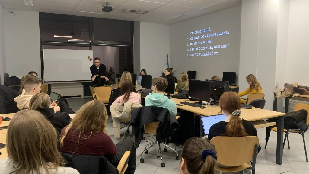 Poza tym czasem prowadzimy też warsztaty wewnętrzne, czyli mniejsze spotkania, które organizujemy jeśli akurat znajdzie się temat, którego chcemy się nauczyć, np. przerabialiśmy już temat CV i portofolio z Krzysztofem Waraksą.